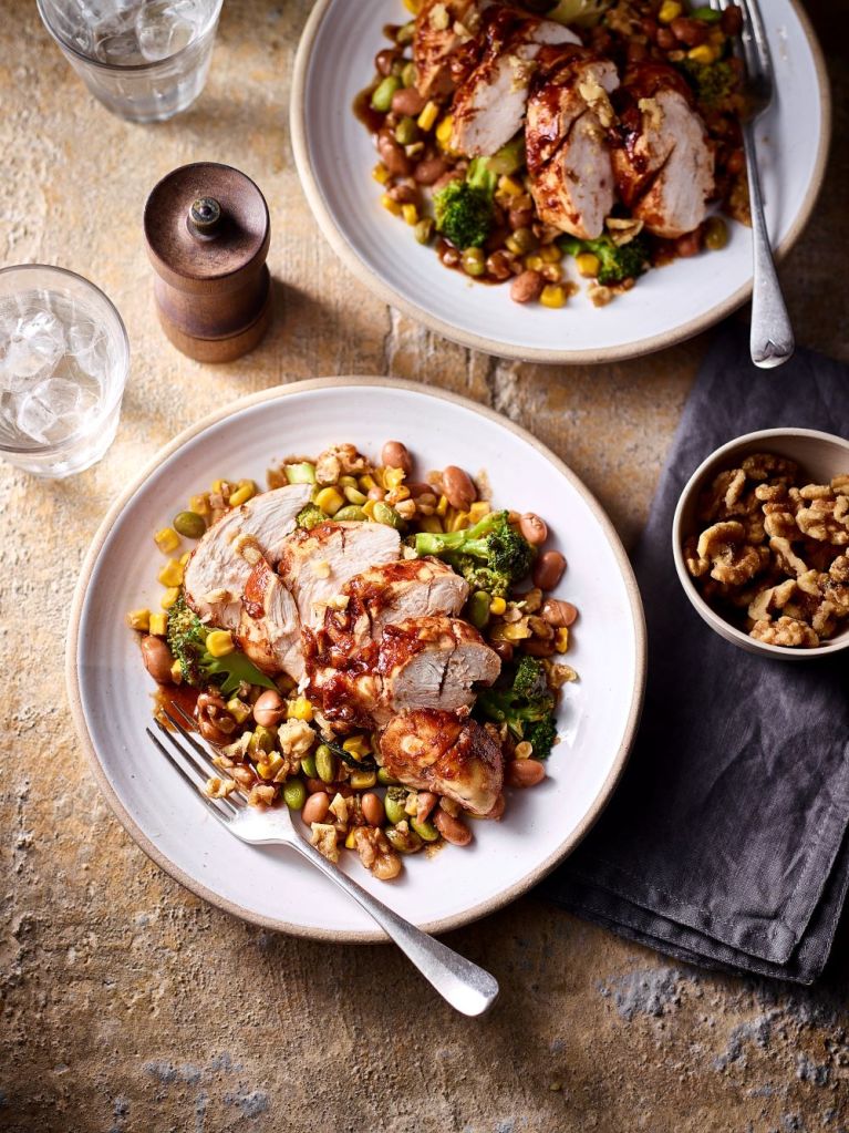 - Meanwhile, blanch the broccoli and edamame beans in boiling water for 2-3 minutes and drain well. Heat the oil in a large frying pan and fry the broccoli mix, borlotti beans, Walnuts and sweetcorn with the remaining marinade and juices from the chicken, for 3-4 minutes.