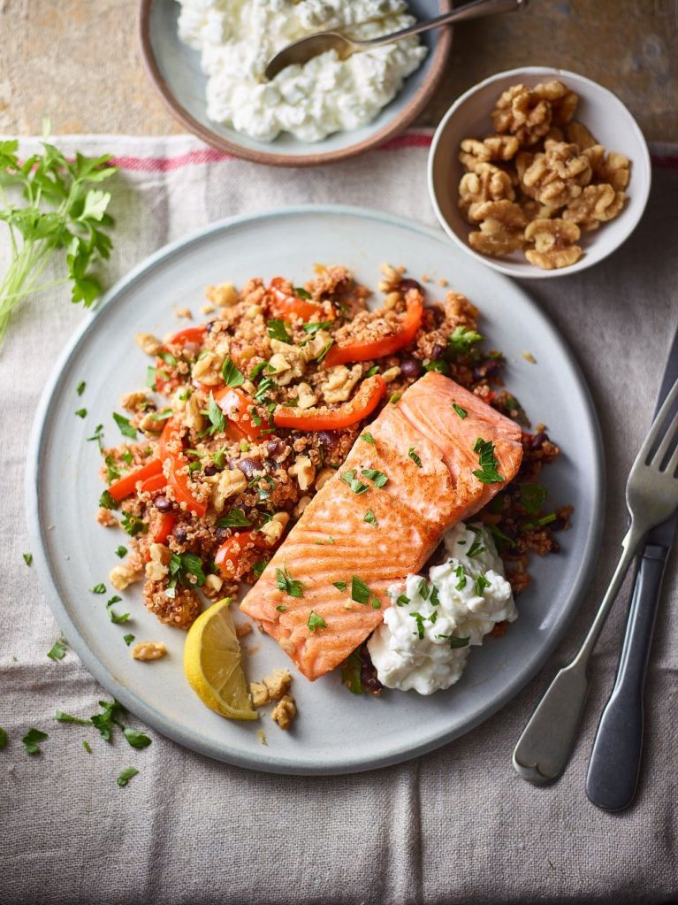 A protein-packed dinner with salmon, quinoa and walnuts – ideal post-training.