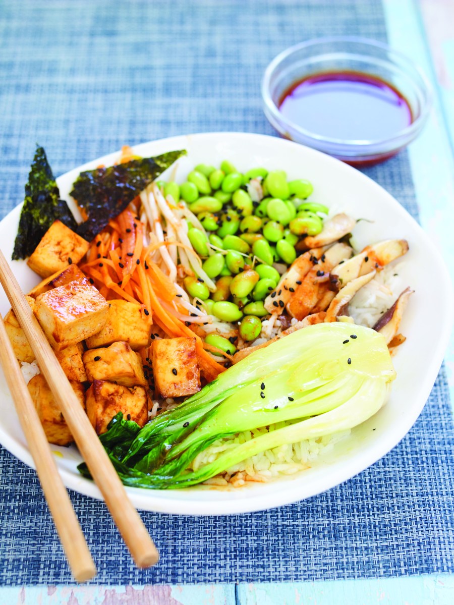 Bibimbap is a hot bowl of rice topped with various individually prepared, seasoned vegetables and protein of choice, flavoured with a gochujang (Korean chilli paste) dressing to create a rich spicy dish. This colourful dish provides plenty of antioxidants and fibre, while the tofu is a good source of protein and phytoestrogens.