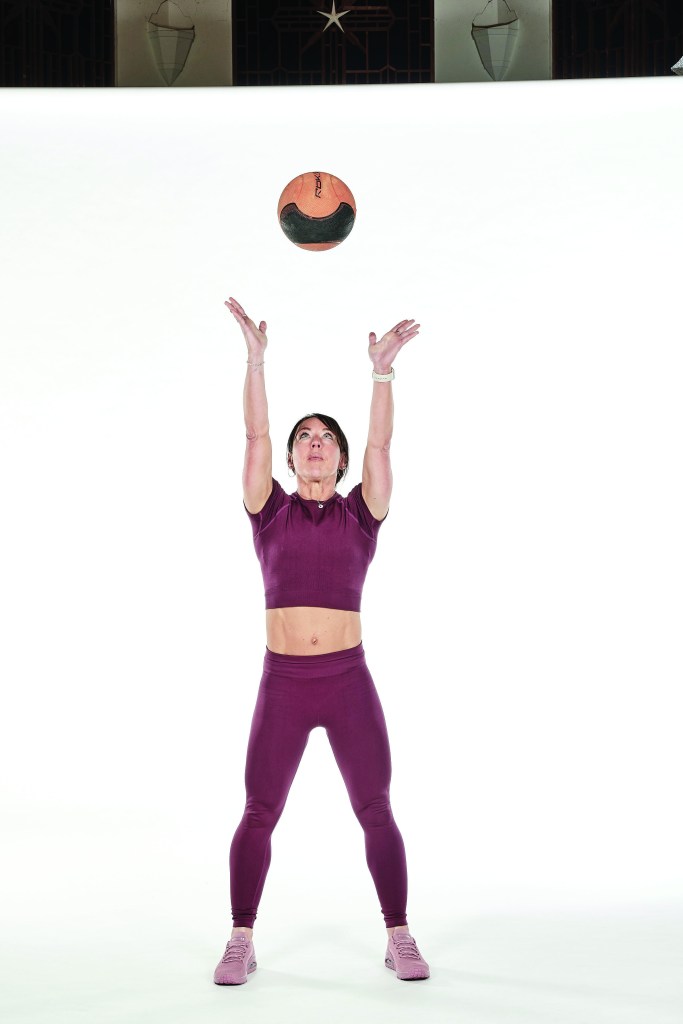 • Push up out of the squat and, as you stand, drive up in an explosive movement, tossing the ball overhead.
