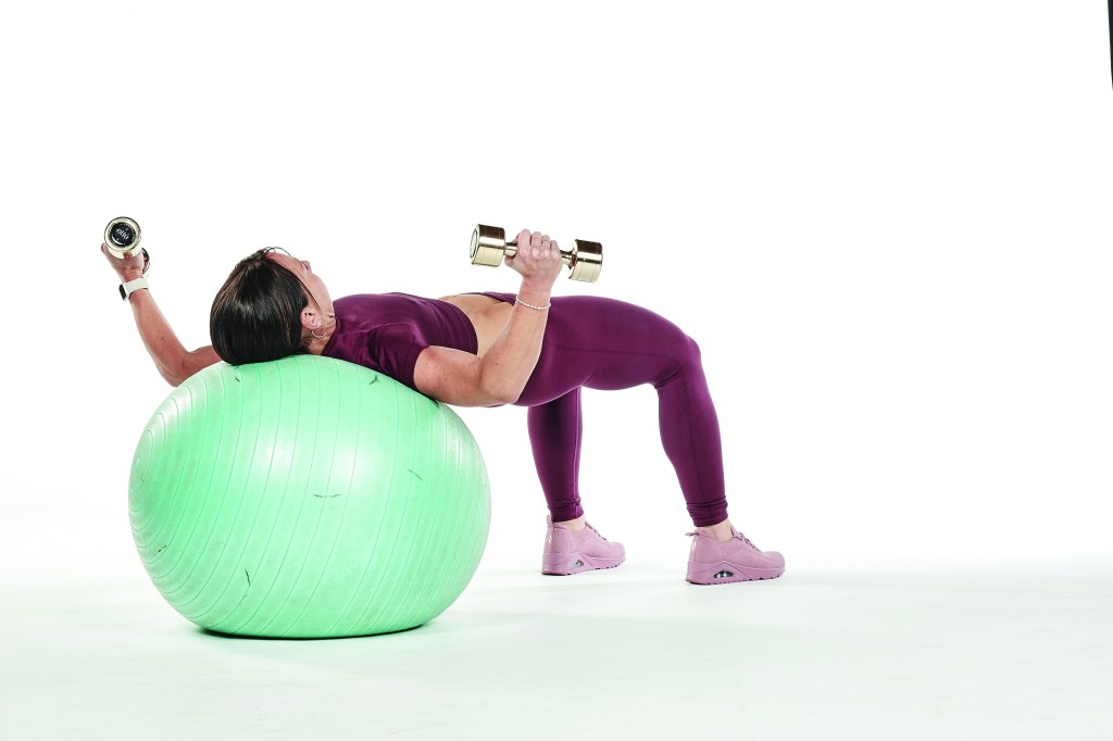 • Lie back on a gym ball with a dumbbell in each hand.